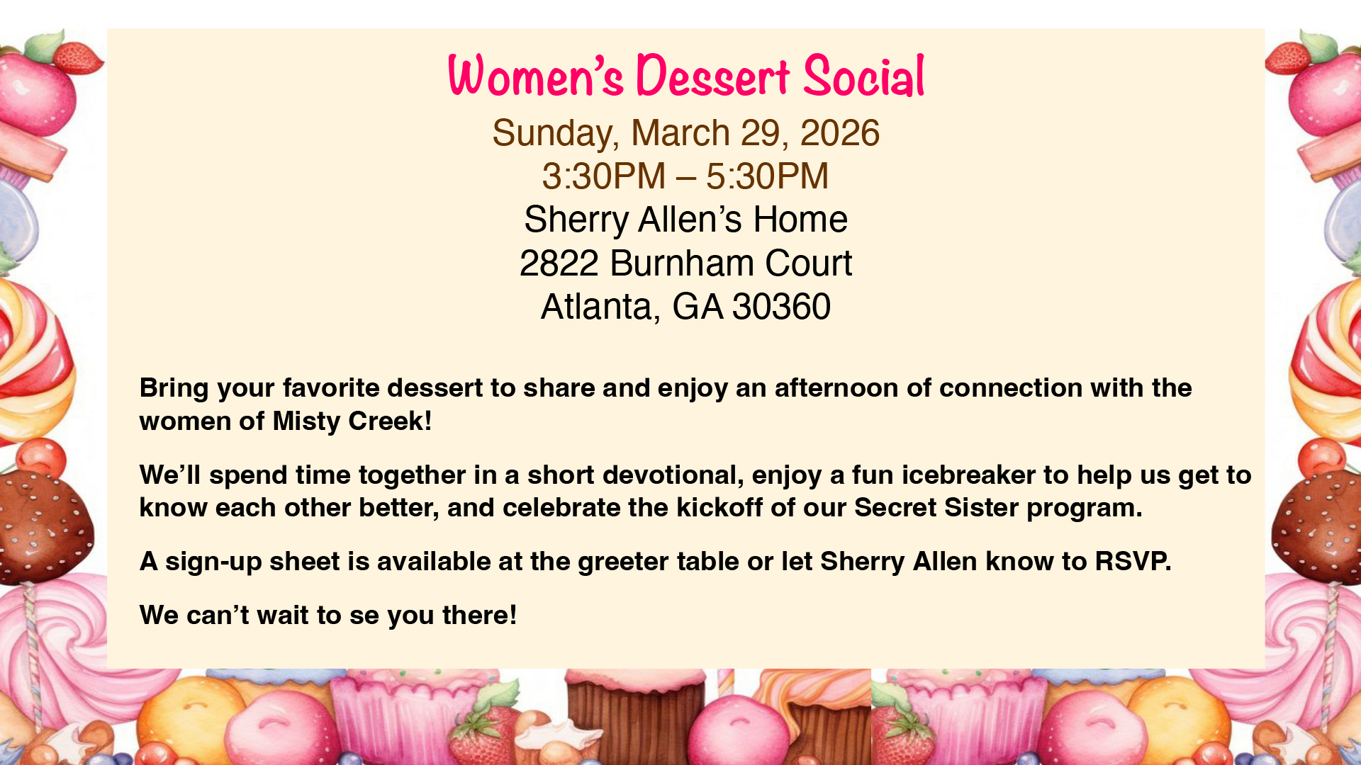 Bring your favorite dessert to share and enjoy an afternoon of connection with the